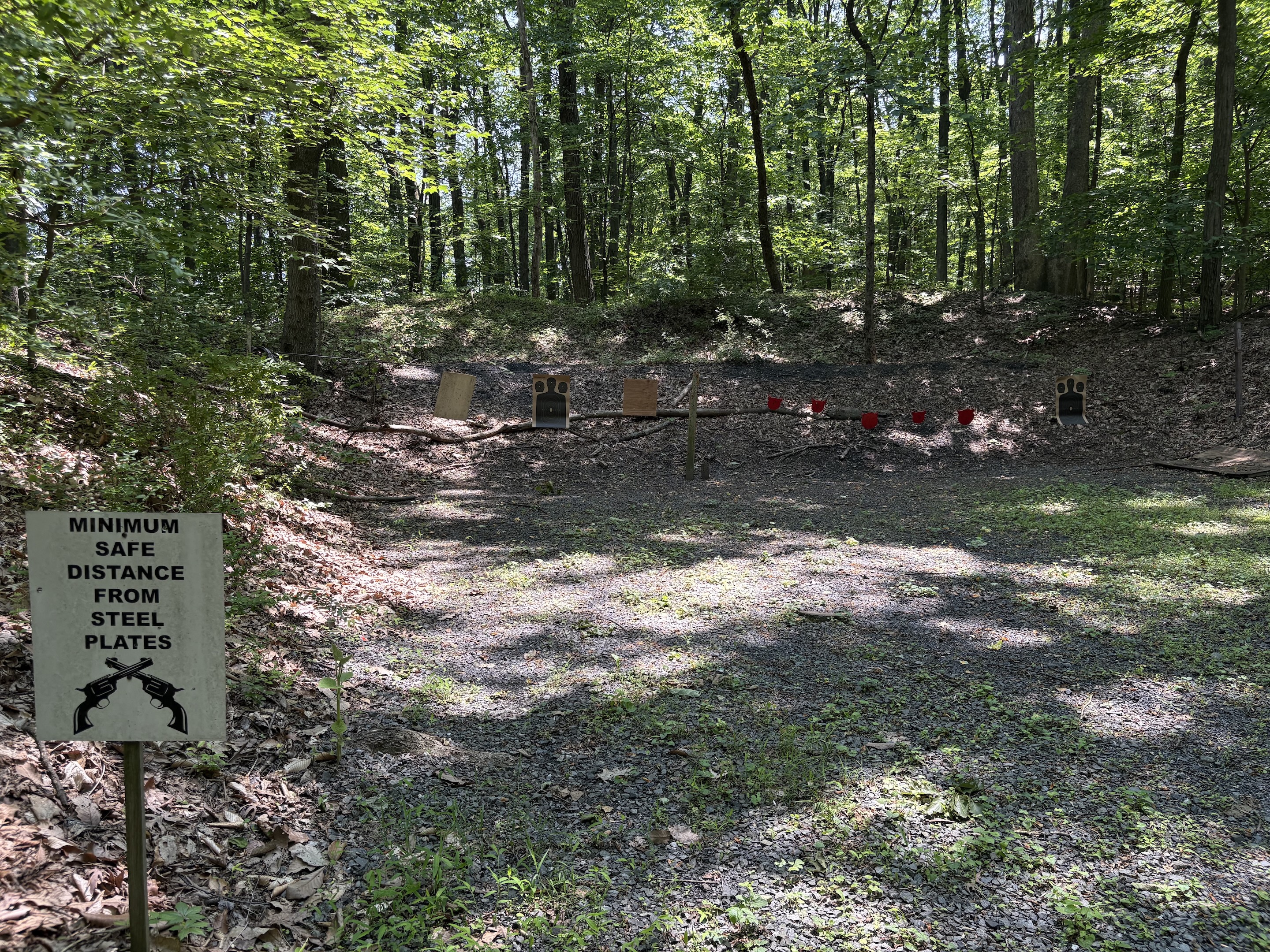 The pistol range has target stands at 25 yards. Paper targets can be used for target shooting, and should be stapled to plywood backers. Various sized steel targets also available. No steel jacket or steel core rounds allowed on reactive targets. No rifles other than .22 caliber rimfire allowed on the pistol range.